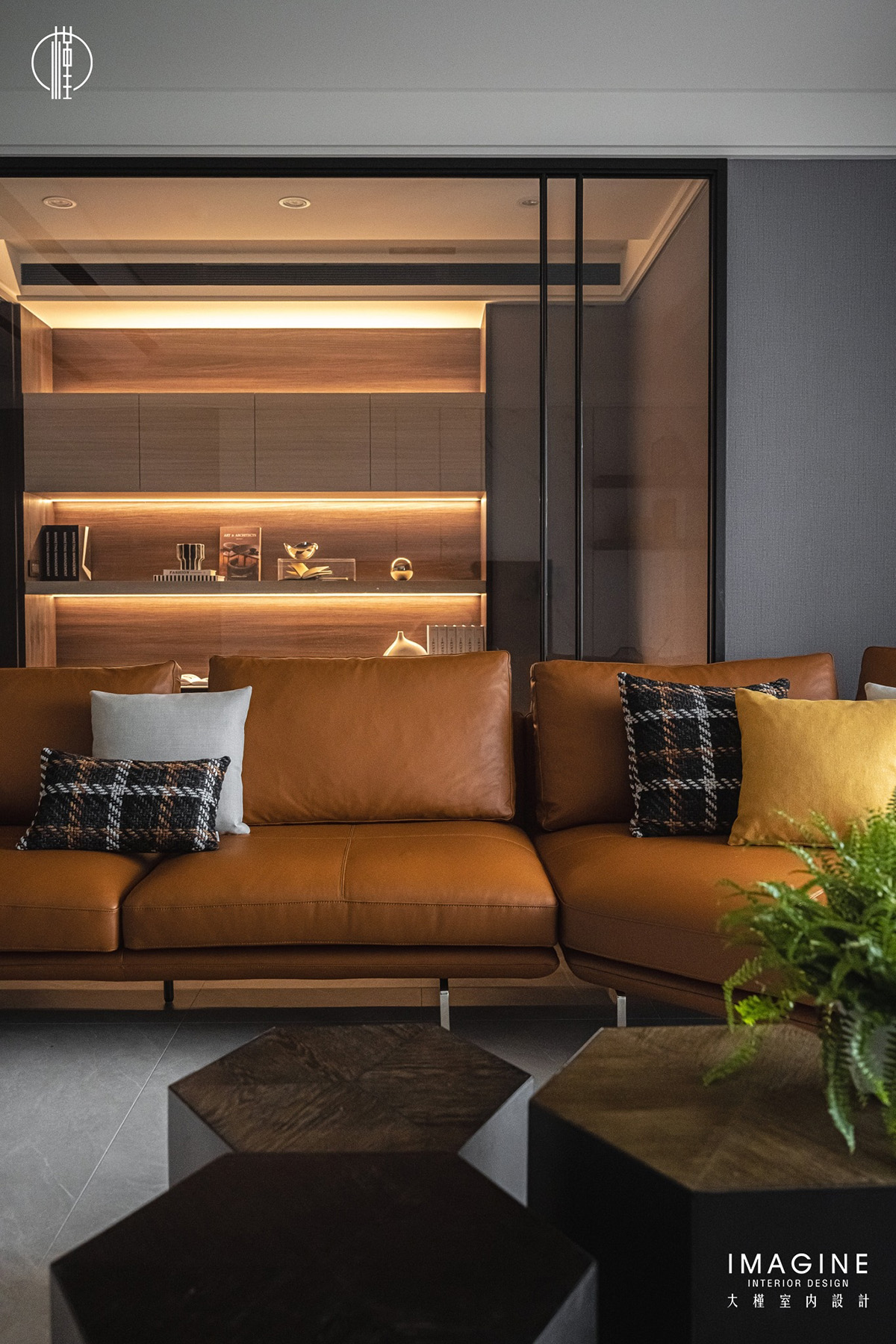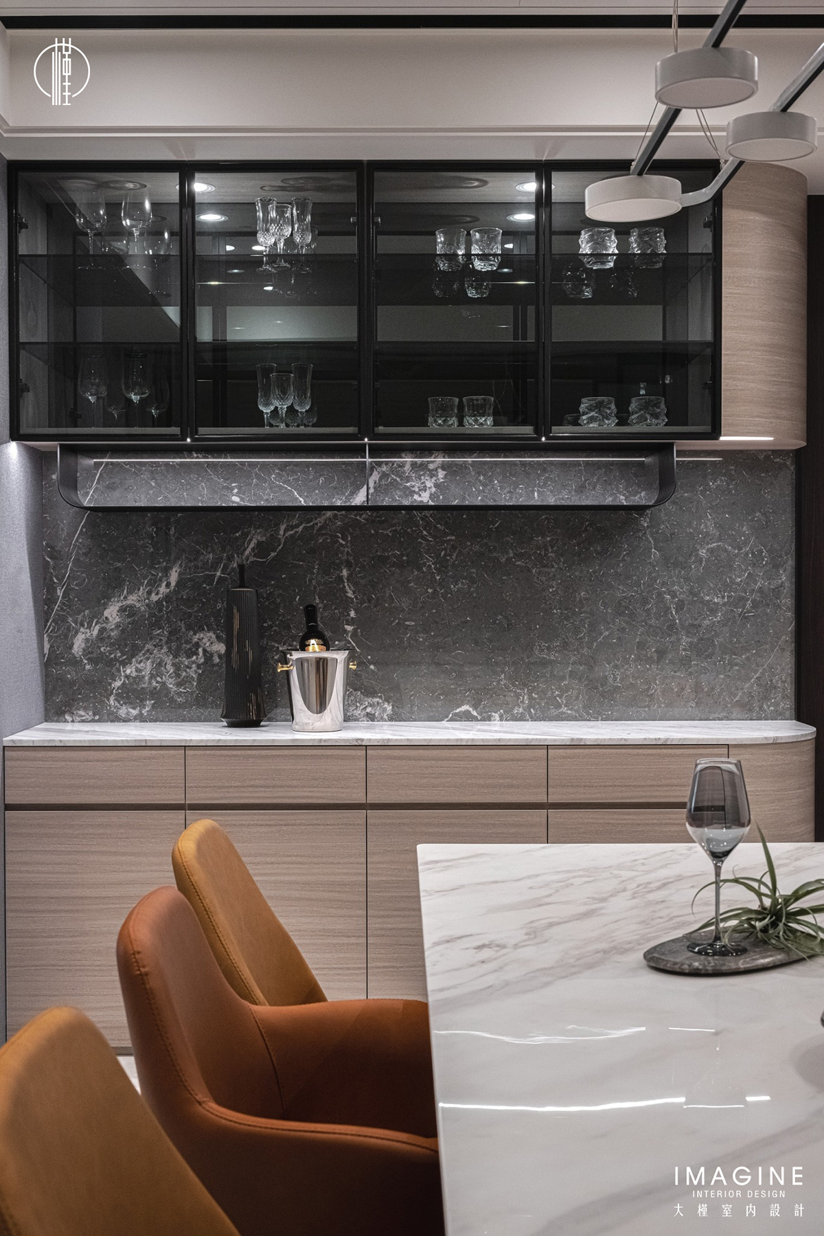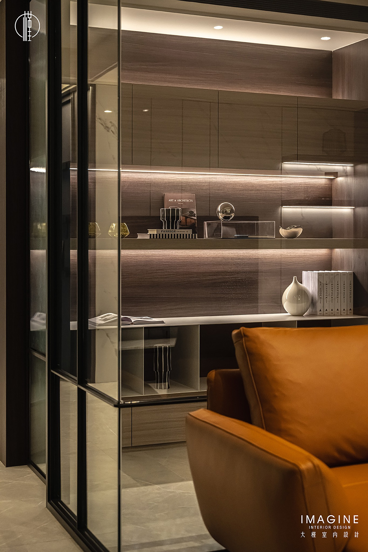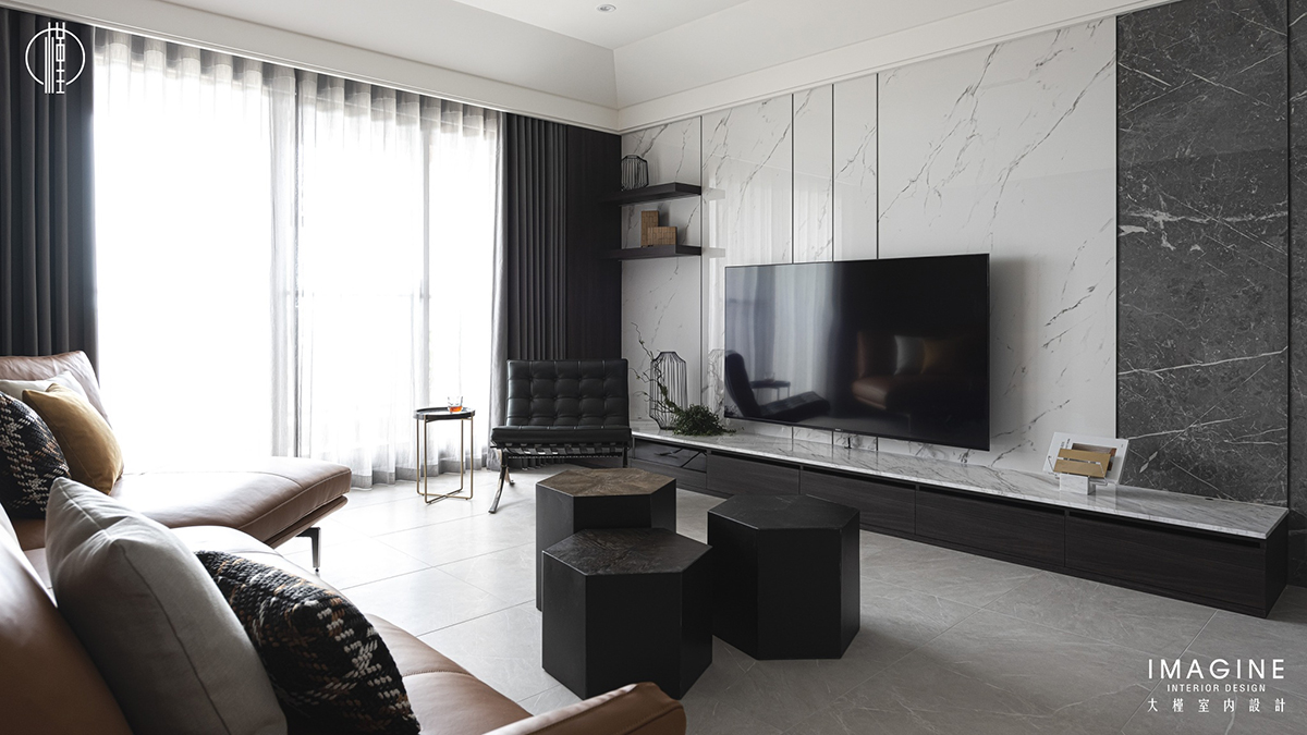 原木紋路的高雅展示櫃,配搭電視主牆進口大板薄磚壁面,木石組合的多層次,多了品味。
