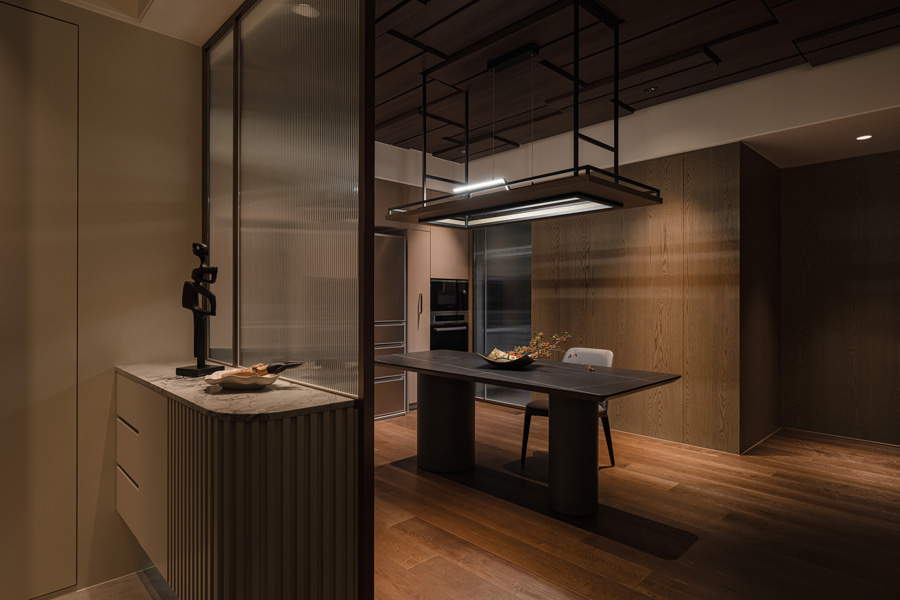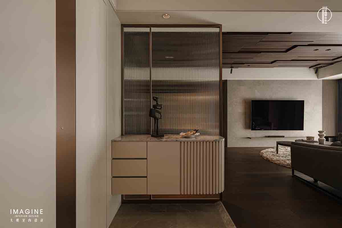 小冰柱玻璃屏風讓玄關有了隱私,大理石檯面的客製設計懸吊櫃體,增加空間輕盈感,高貴典雅,大方雍容。