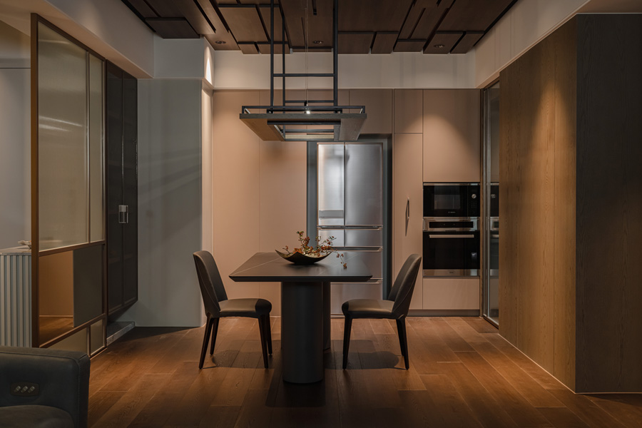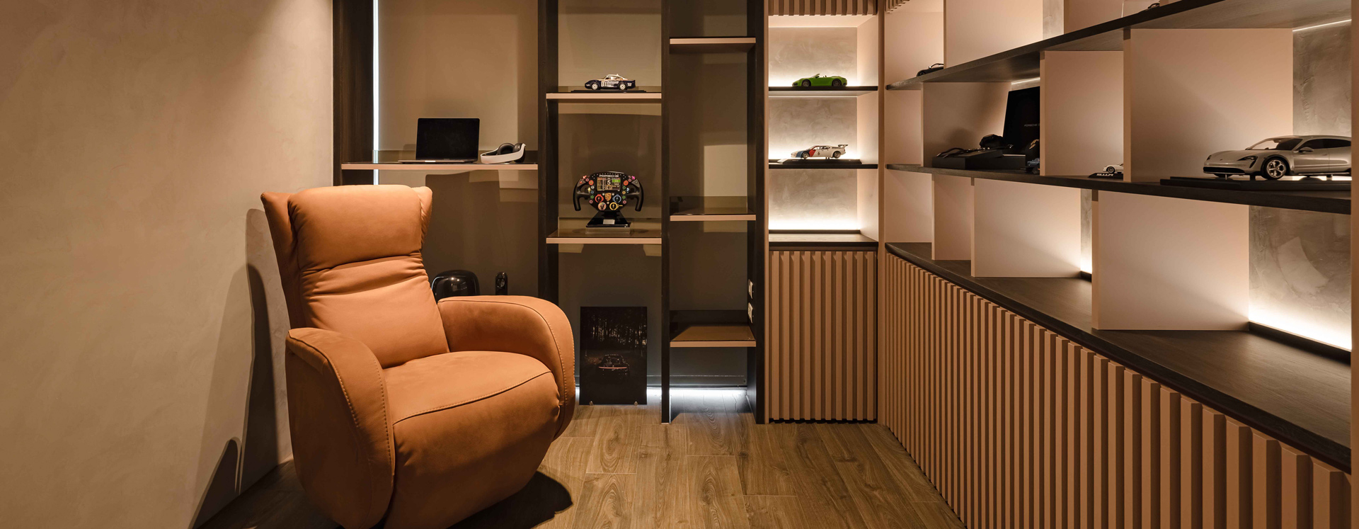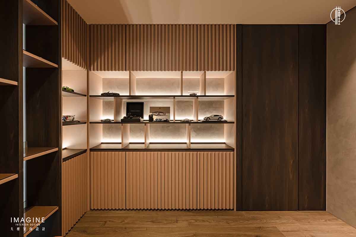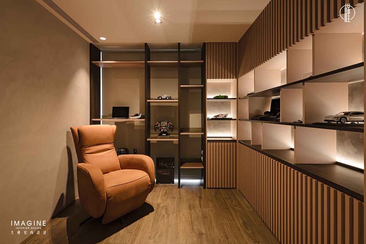格柵打造的展示櫃和書櫃,收納齊全,功能多元,質樸灰色牆面和木色櫃體,讓書房中的使用者,專注眼前,安靜工作。