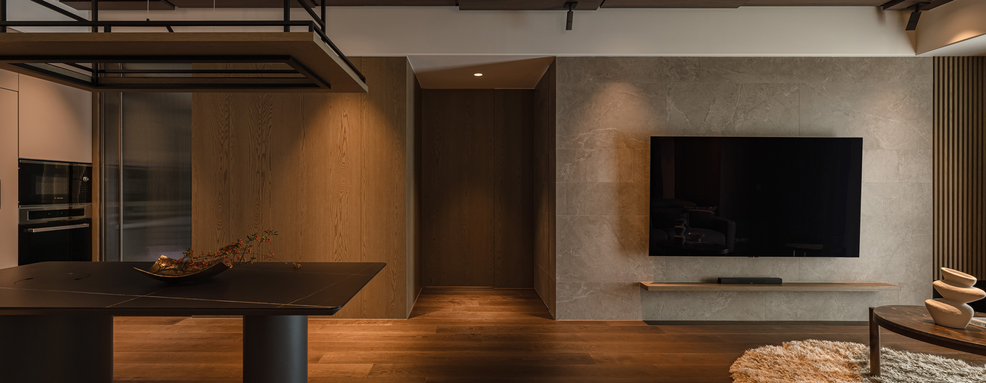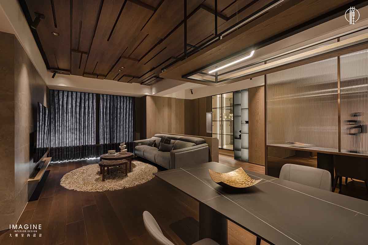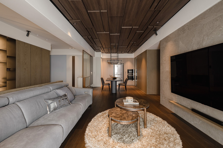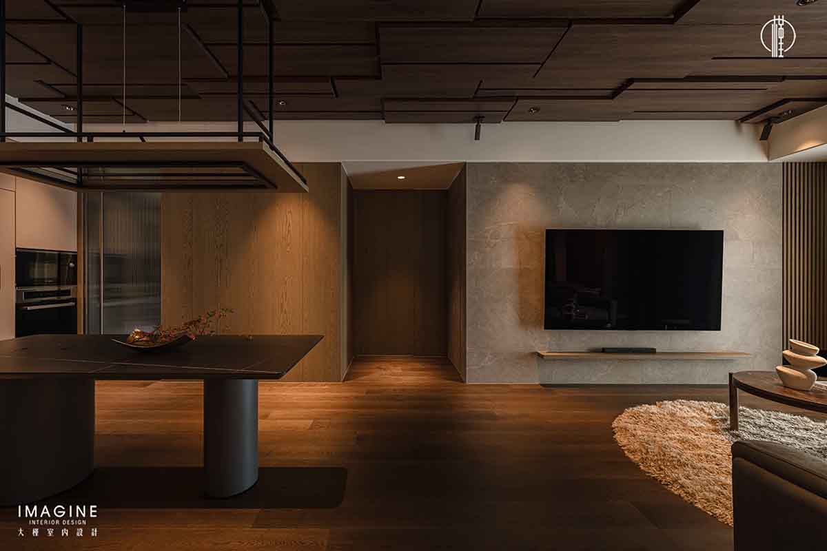 層次交錯的天花板是視覺主題,訴說著東方韻味的藝術感與趣味性,與進口薄片磚的電視主牆,和空間整體沉靜原木色,相互輝映,帶給視覺上的心靜盛宴。