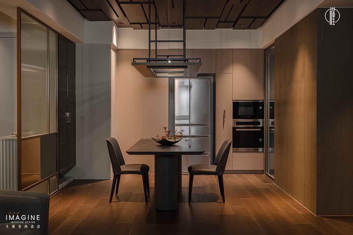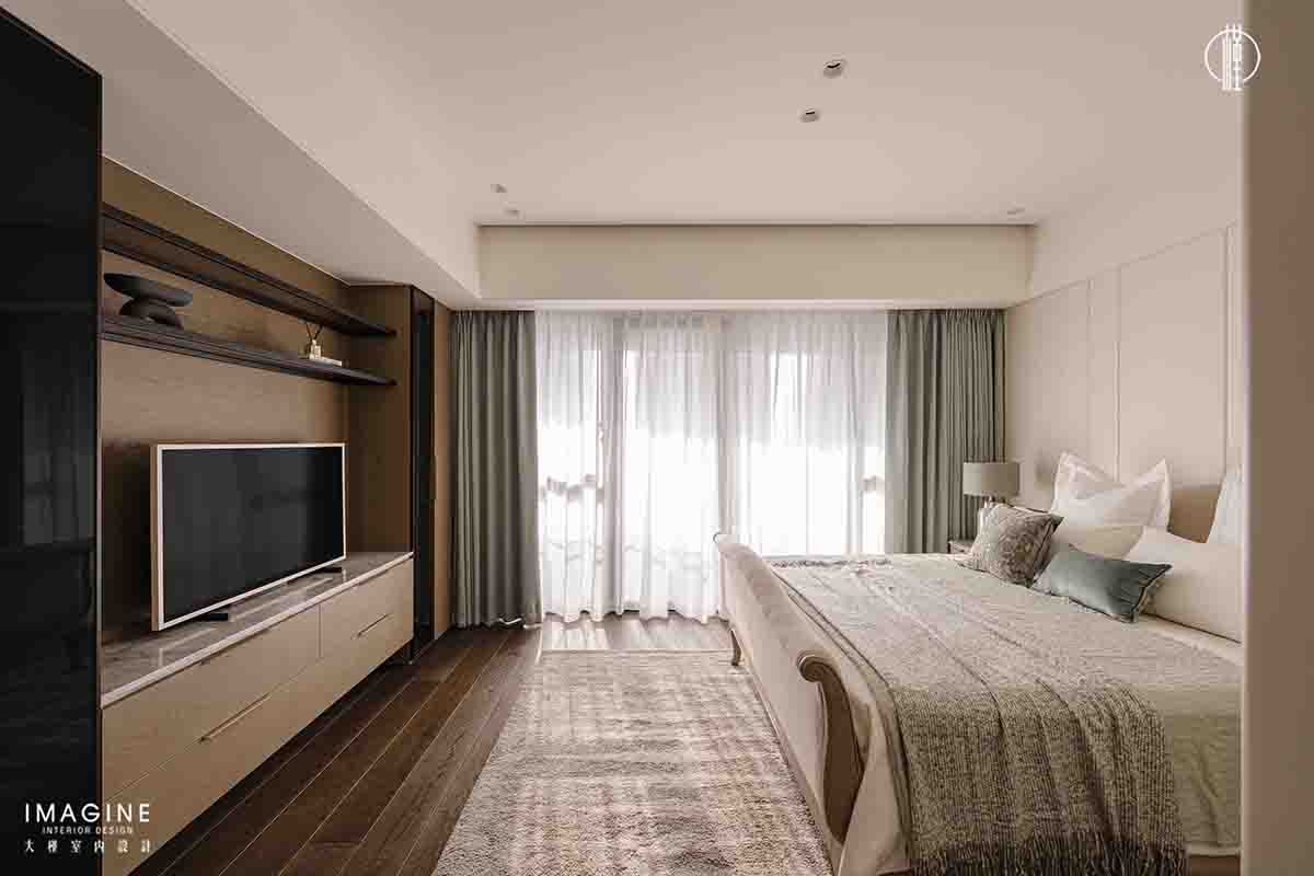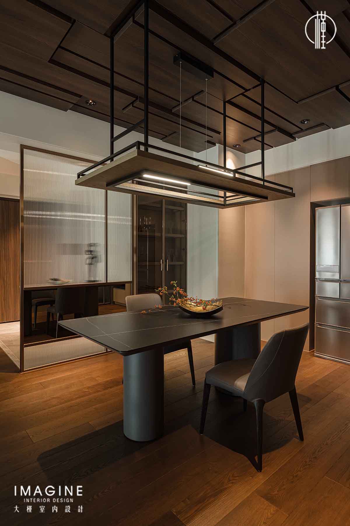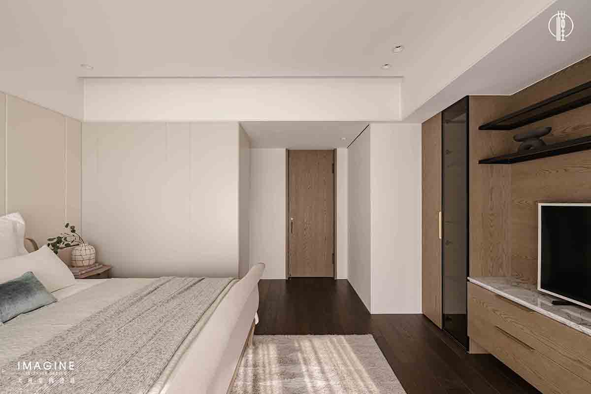 層次交錯的天花板是視覺主題,訴說著東方韻味的藝術感與趣味性,與進口薄片磚的電視主牆,和空間整體沉靜原木色,相互輝映,帶給視覺上的心靜盛宴。
